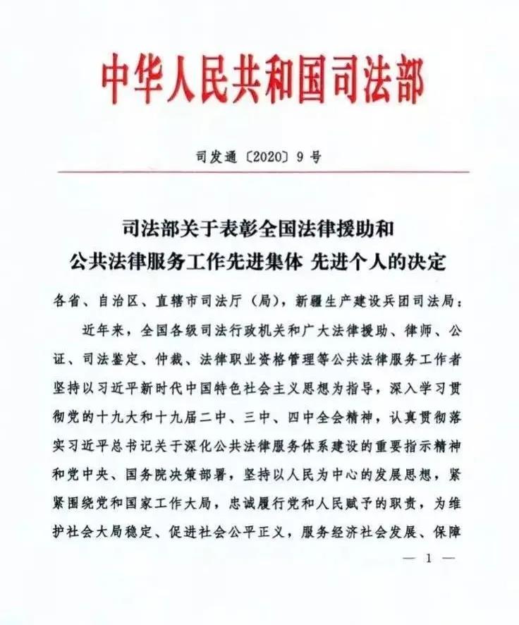 近日,司法部下发了《关于表彰全国法律援助和公共法律服务工作先进集体 先进个人的决定》(司发通【2020】9号),分别对全国法律援助和公共法律服务工作先进集体及个人进行表彰。我所车勇律师被司法部授予“全国法律援助先进个人”荣誉称号。