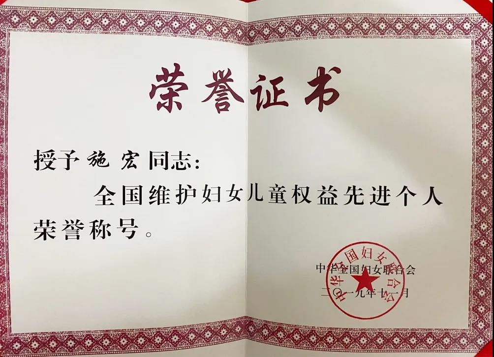 日前,全国妇联表彰了996个“全国维护妇女儿童权益先进集体”、995名“全国维护妇女儿童权益先进个人”。其中,我所施宏律师荣获“全国维护妇女儿童权益先进个人”荣誉称号。
